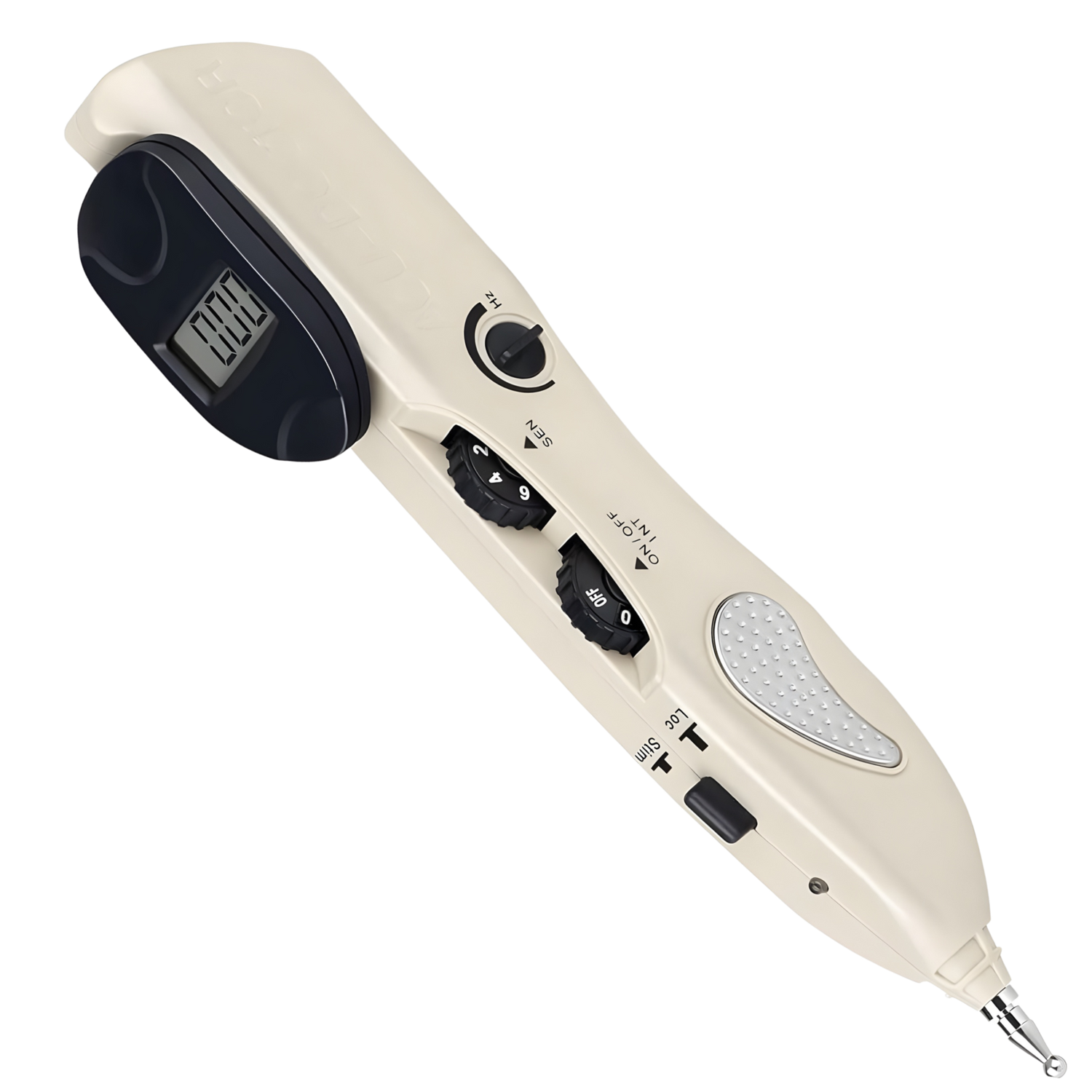 Dispositivo de terapia de acupuntura eléctrica con pantalla digital para localizar puntos de acupuntura o puntos gatillo. Incorpora un sistema de detección y un botón de estimulación inmediata para aplicar el tratamiento justo después de encontrar el punto.