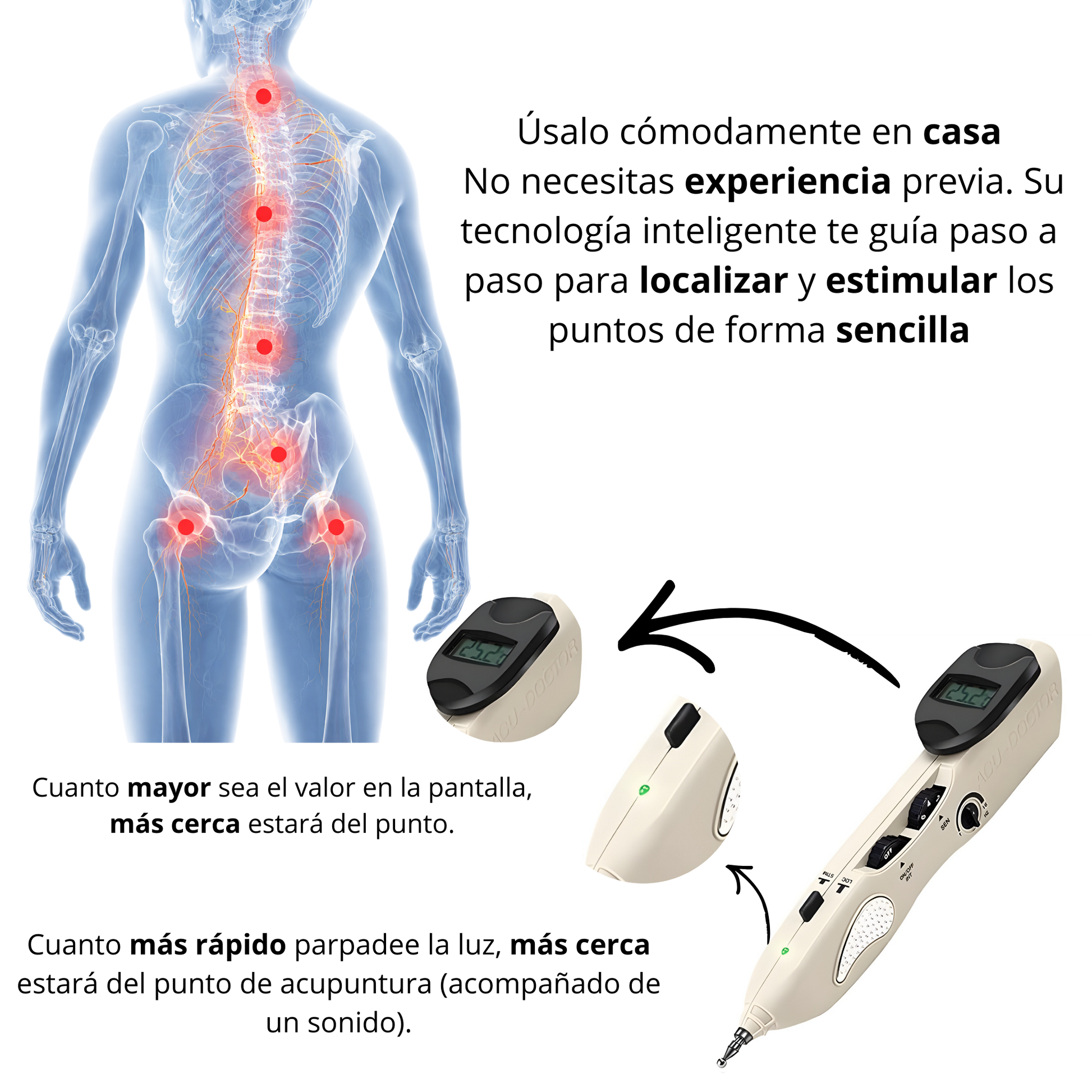 Desliza suavemente la punta sobre la piel hasta que la luz parpadee y el sonido se acelere; esto indica que estás cerca del punto de acupuntura. -